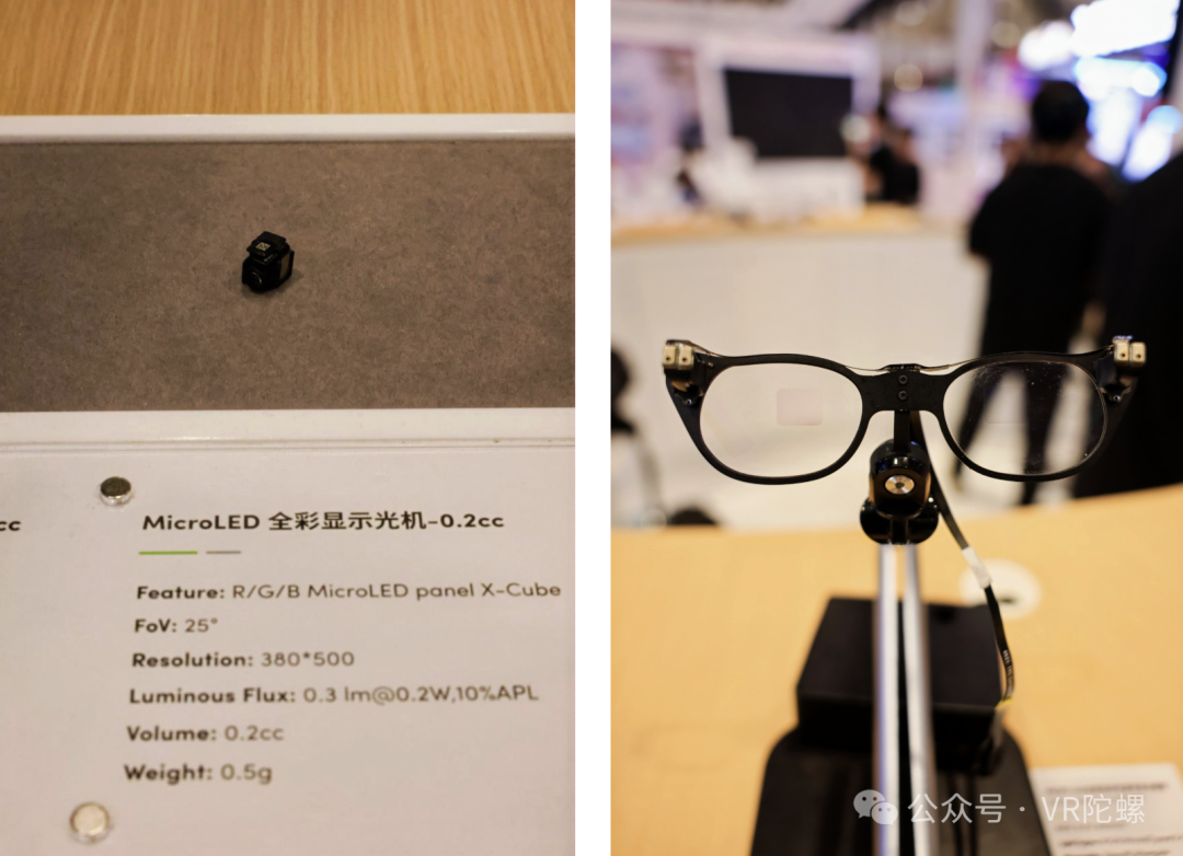 手机拍摄图片,略有压缩和色差,以本色体验为准从现场可以看到,该全彩Micro-LED光机相称微细,仅有黄豆粒大小,很难思象这是在cube合色决策下,融入R、G、B三色Micro-LED基板下变成的产物。搭配玻璃基板的衍射光波导F22Gi,在保证全彩高清虚像袒露的同期,物理全国透过率弘扬也十分可以,彩虹纹大幅减弱。